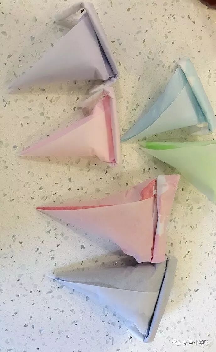 这里小饕插播一个省钱方便的窍门。烘焙中装饰要用到挤花袋,Wilton卖的挤花袋也不便宜,白色的可多次使用,透明的洗干净再用一次也可以,但很不方便。专业人士大多使用 PARCHEMENT PIPING BAG,就是用烤纸自制挤花袋,方便好用,非常适合家庭烘焙,每种颜色装饰奶油或蛋白霜需要量不多,但色彩种类多的情况。以下是流程图示,如何自制烤纸挤花袋。
