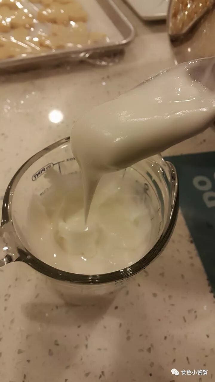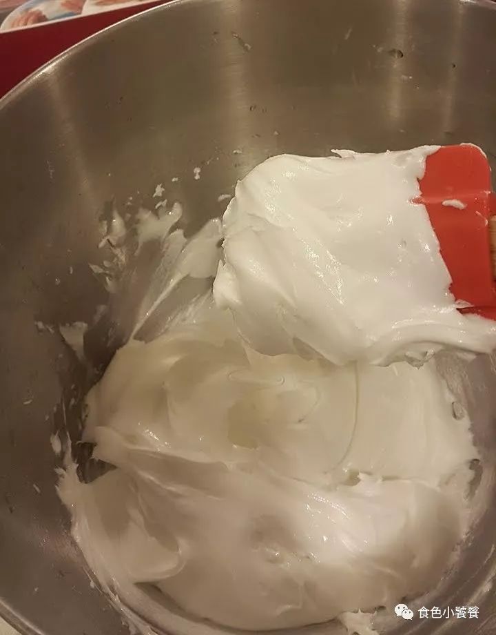 原料混合,高速打发到出现尖角即可“胶水”的稠度,应该是勺子舀起,倒扣不会掉落。