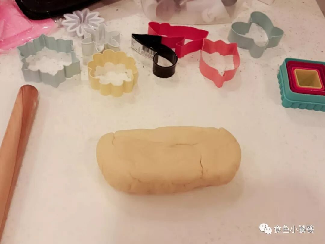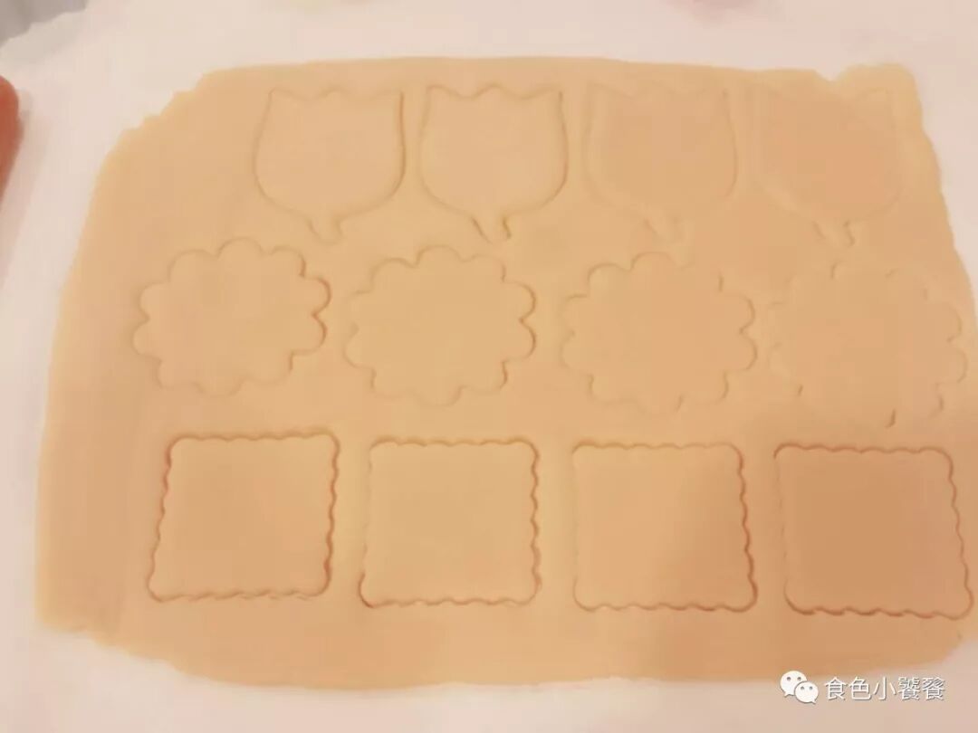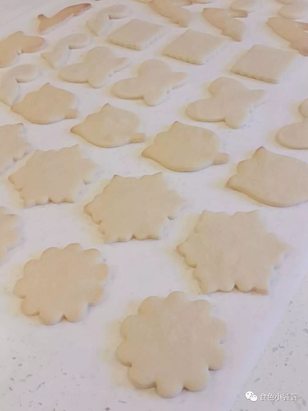 7. 取出擀成0.3~0.4厘米厚的面皮, 使用饼干模具,切割成想要的形状