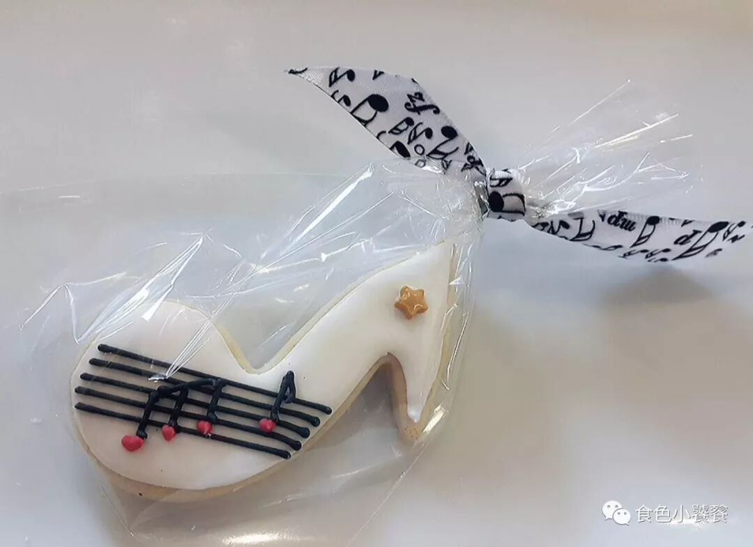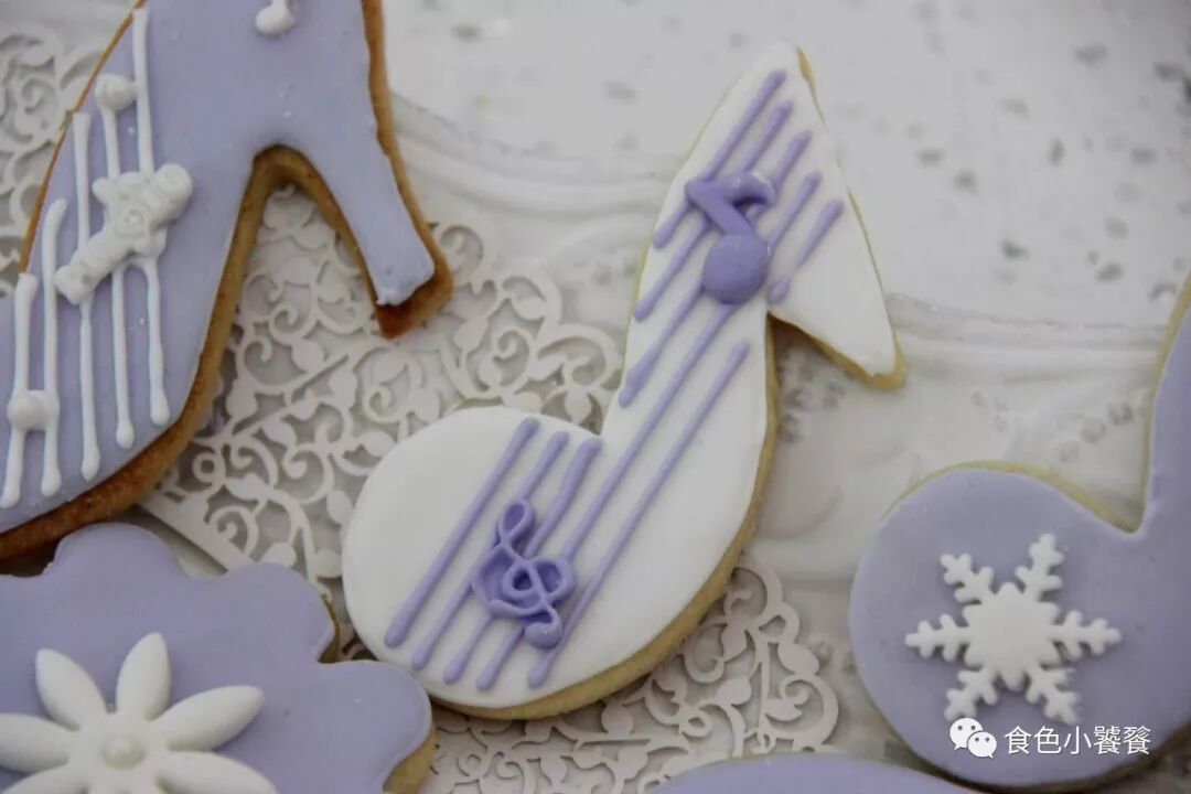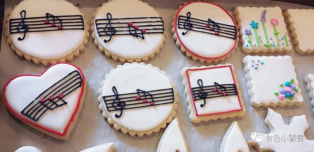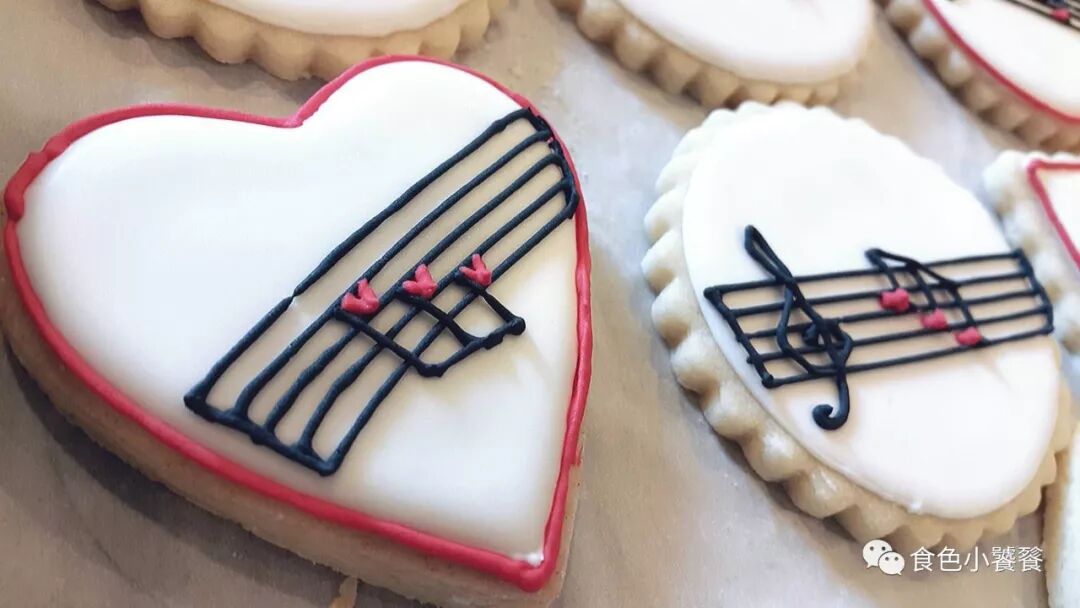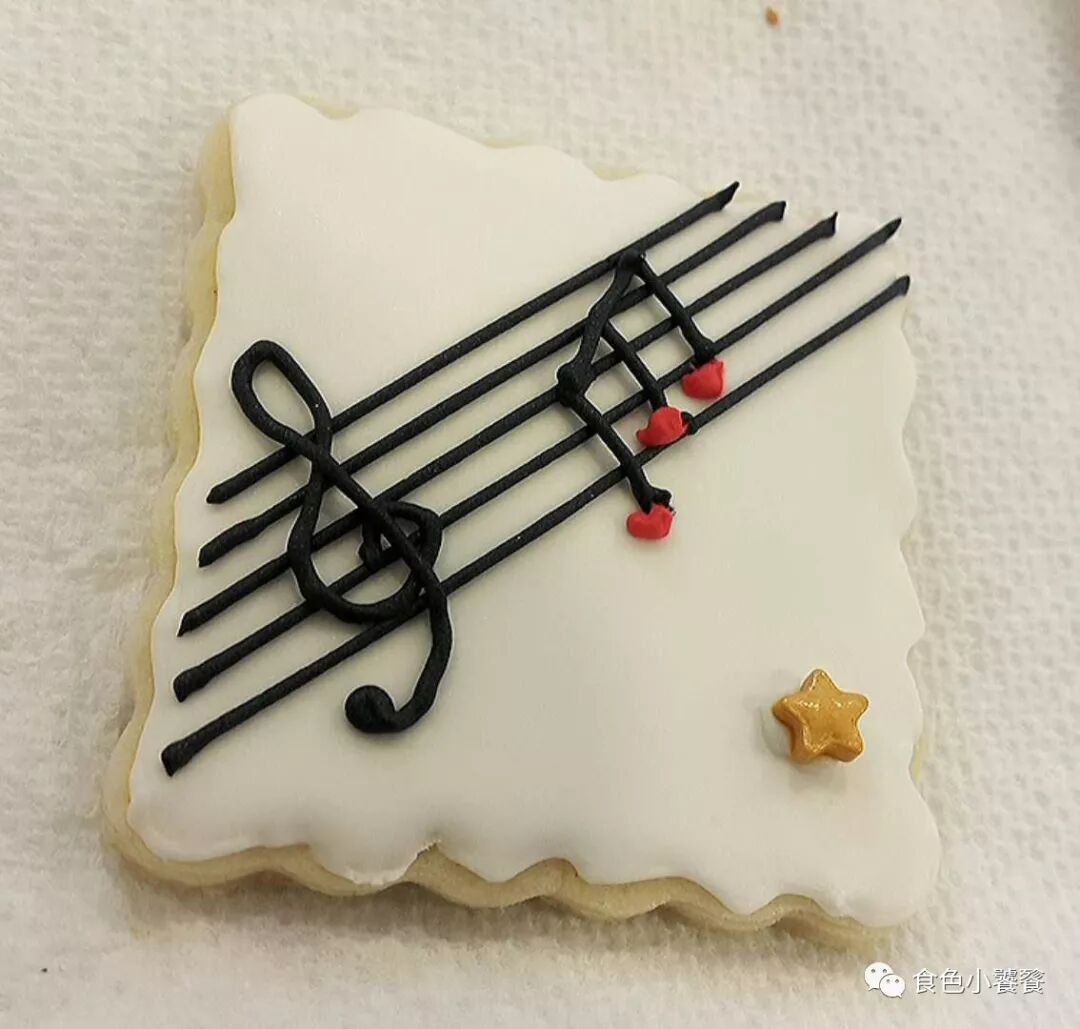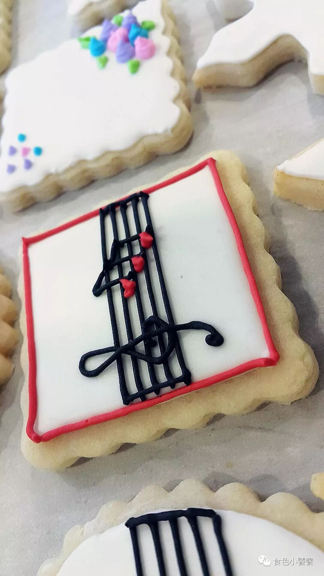 1)既可以用勾边蛋白霜点缀各种颜色和图案。比如:乐谱曲奇,就是分别用黑色和红色,来制作出立体的乐谱。