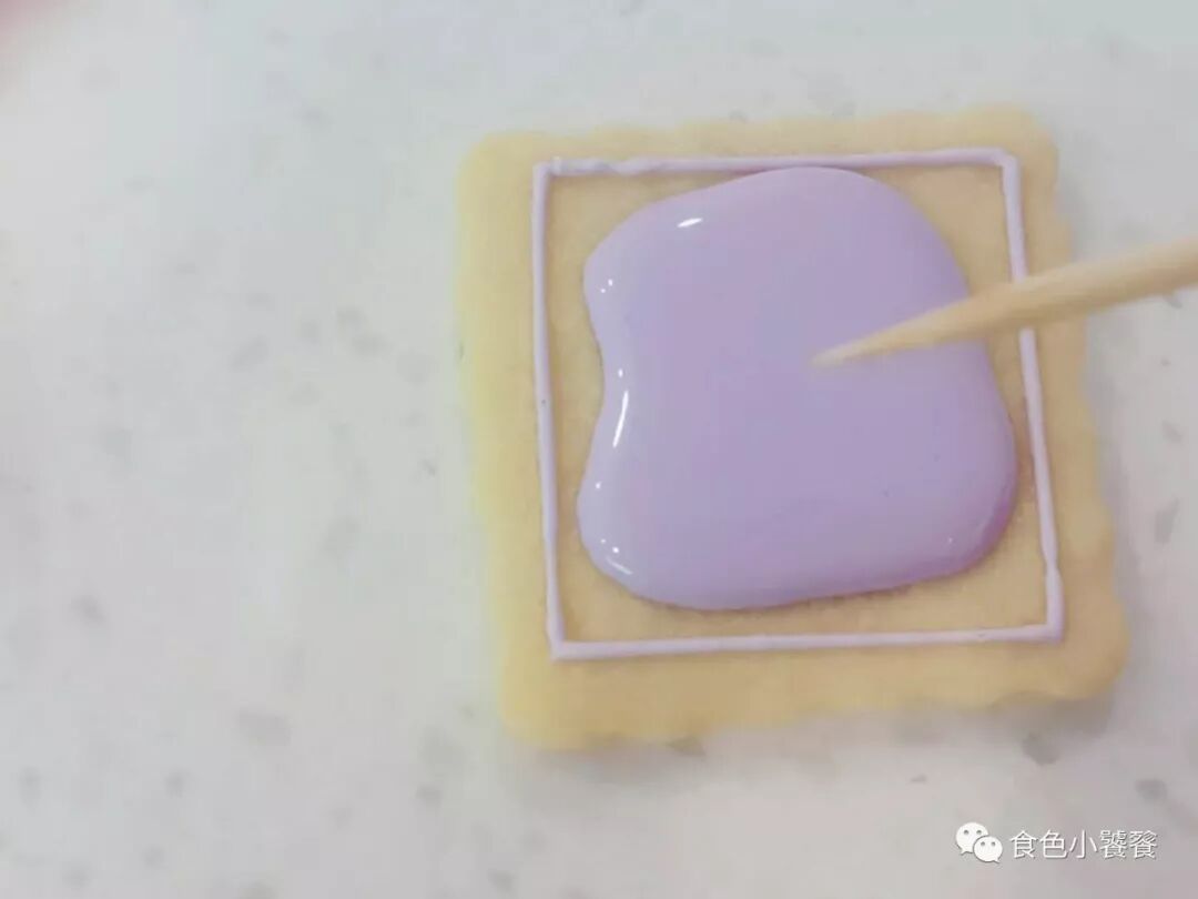 给一点时间,让围边干燥固化,这个过程很快。然后,用装满平面填色蛋白霜的挤花袋(这个嘴可以剪稍微大一点,方便流动),在框内各处,均匀挤上蛋白霜,控制一下量,太多会溢出,太少不够平滑。然后,用牙签,小心把流动的蛋白霜拉到固化的围边上,慢慢形成一个平滑的表面,并用牙签戳破所有小气泡。静止一旁干燥。