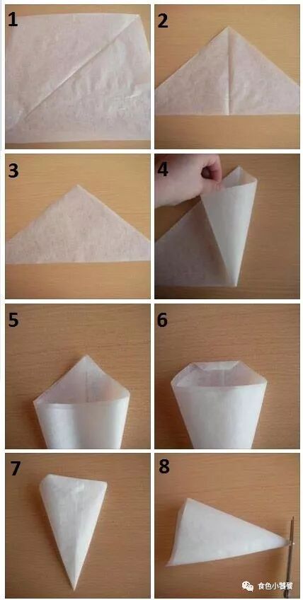 取一个三角形,以底边中点为挤花嘴的尖,将一个底角向内卷起,角和顶点重合。形成三角圆锥。