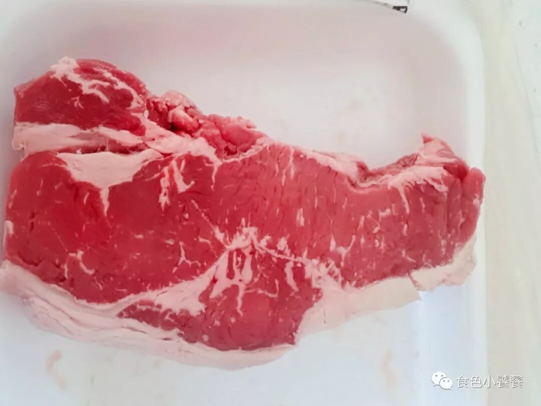 1) 纽约牛排一块。(带点脂肪和筋比较香)