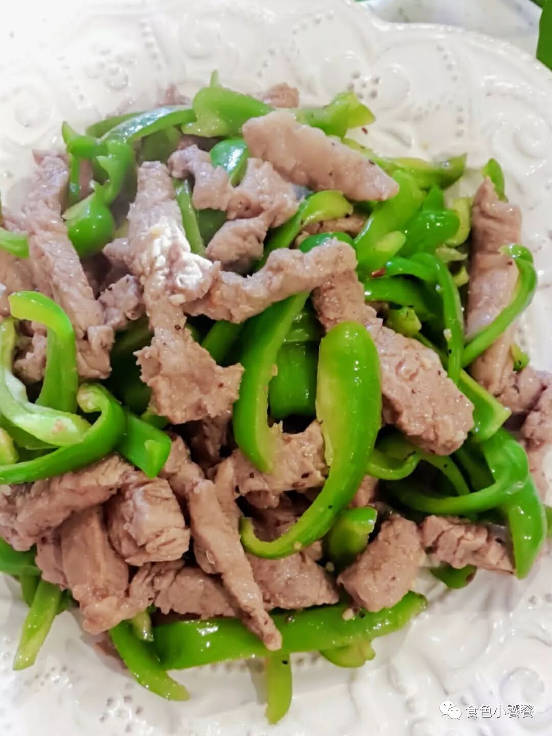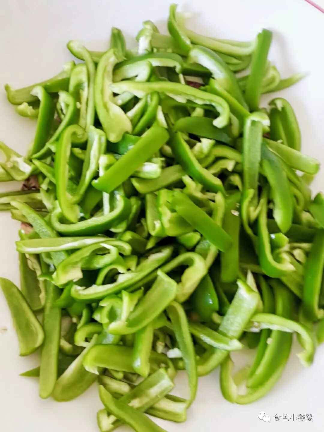 6)炒牛排条剩下的油,接着大火炒青椒丝,少许盐调味,这种薄皮青椒很容易熟,