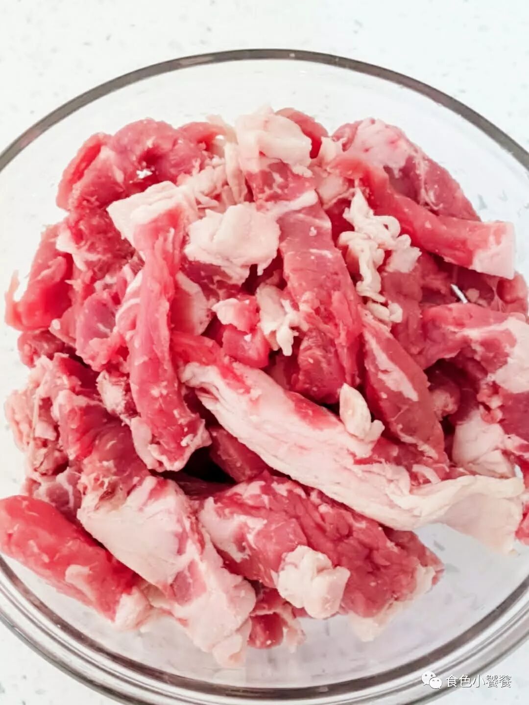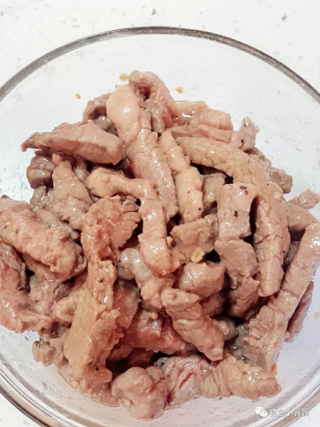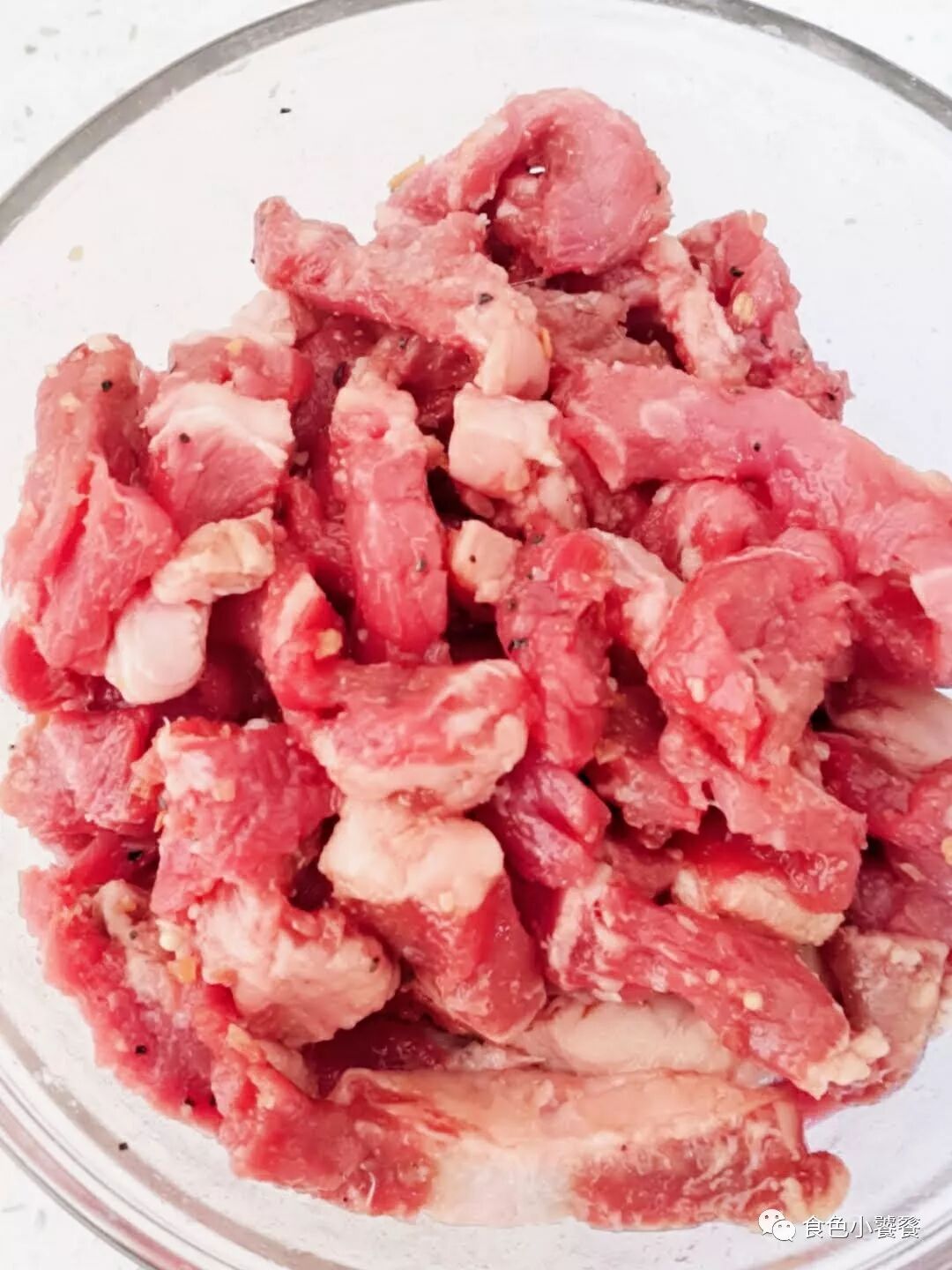5)锅内少许油,烧热,入腌好的牛排条,迅速翻炒,表面变色马上捞起