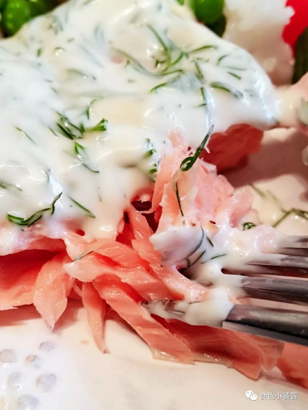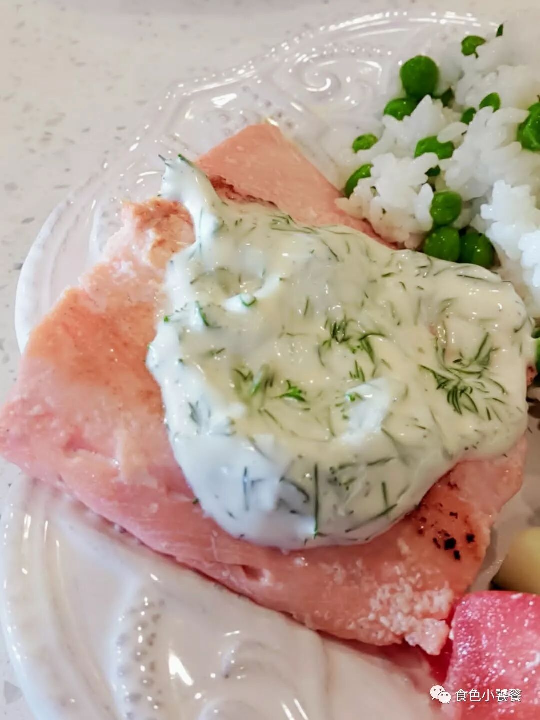 4)煎好的鱼排,马上盛出,浇上做好的莳萝酱,就可以大快朵颐了。