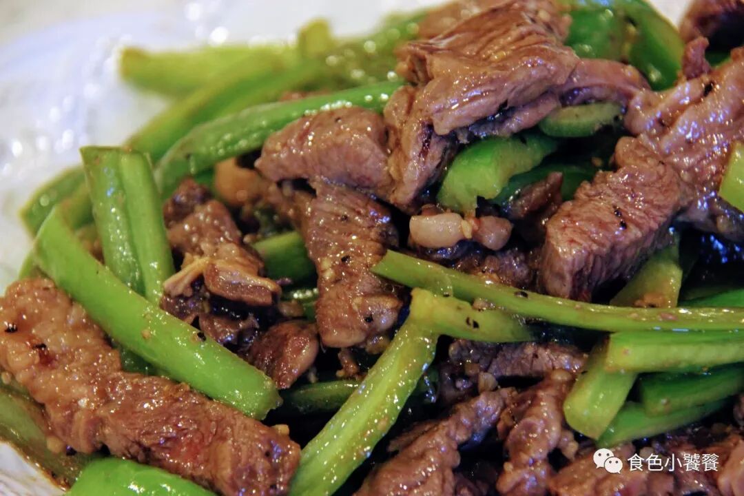 翻炒到变更绿,入牛排条,点少许美极鲜酱油翻匀出锅。