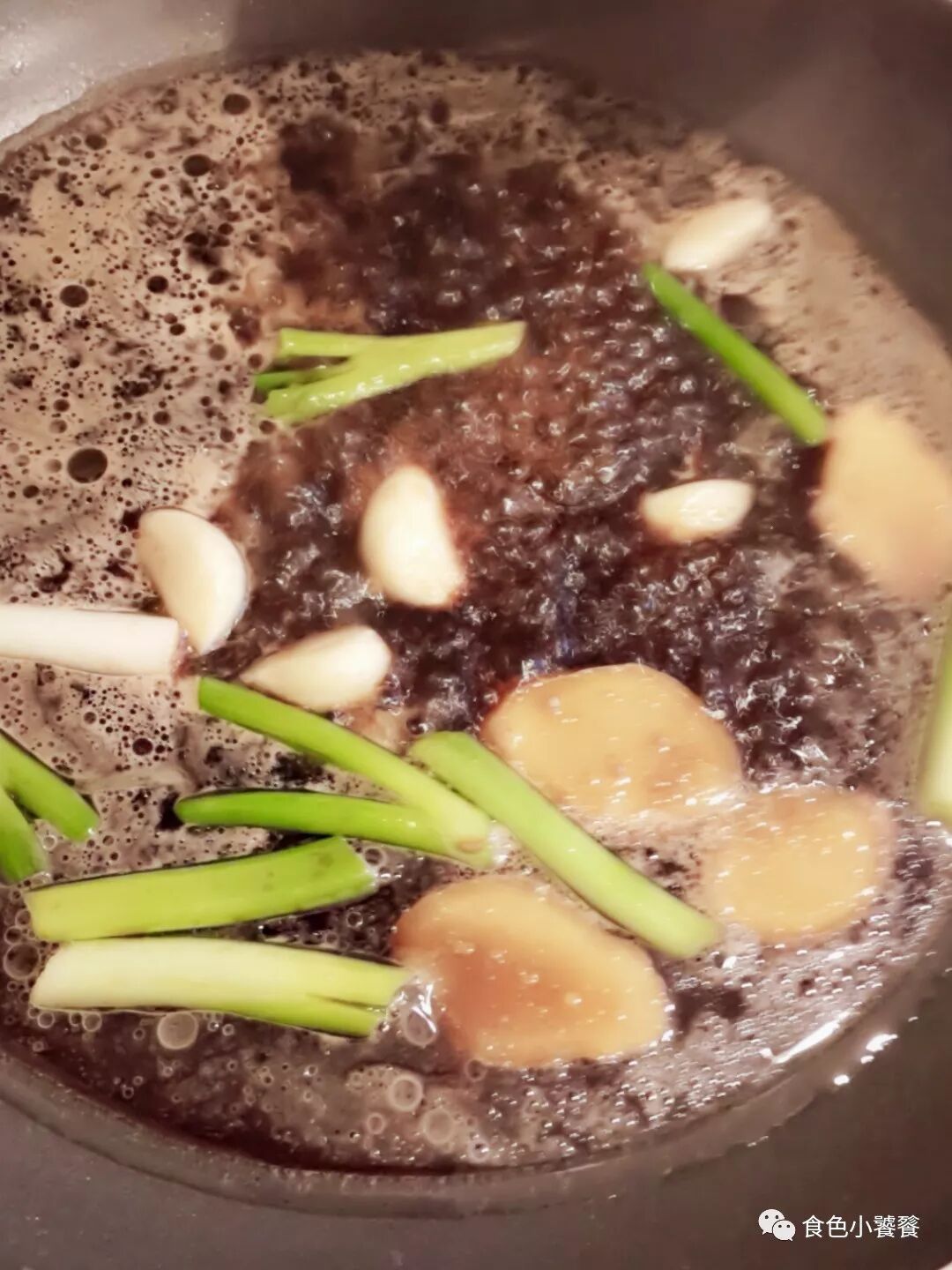 2)锅烧热,少许油,炒香葱姜和蒜。 加入酱油,醋,糖,少许厨用酒,