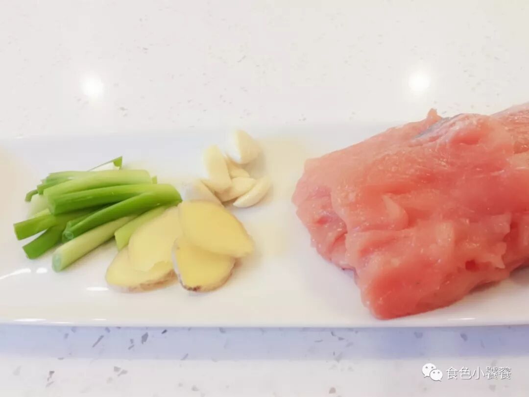 1) 野生三文鱼排,切段拍干,加少许盐,胡椒粉,蒜粉,腌制半小时。葱姜蒜切片切段。