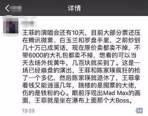 一面是高昂得超过人们认知边界和心理底线的票价,一面是王菲粉丝群体“70、80后为主、高学历理性消费者”的用户画像,两相结合,“票卖不动”就成了必然的结果。我跟几位中小黄牛聊了聊,他们都不约而同地诉苦:“原以为可以囤积居奇,这下彻底砸手里了。我们就是背锅的。”