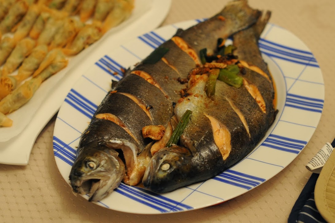 10。华人超市的活鱼全抢光了,俺拿两条鳟鱼代替。用大铸铁铁煎鱼,着急下锅早了点,怕破相没敢翻身。