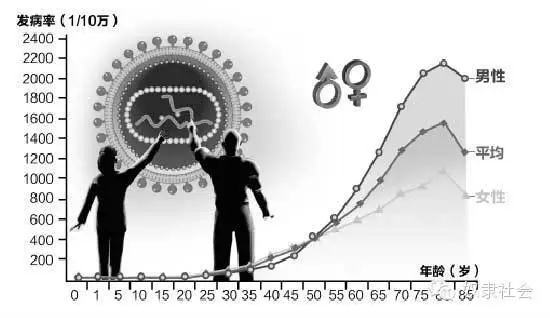 2013年中国第一次发表了《肿瘤年报》,从下图中可以清晰地看出:第一:无论男女,癌症发病率从40岁以后就是指数增长;第二:老年男性比女性得癌症概率高,主要是前列腺癌。