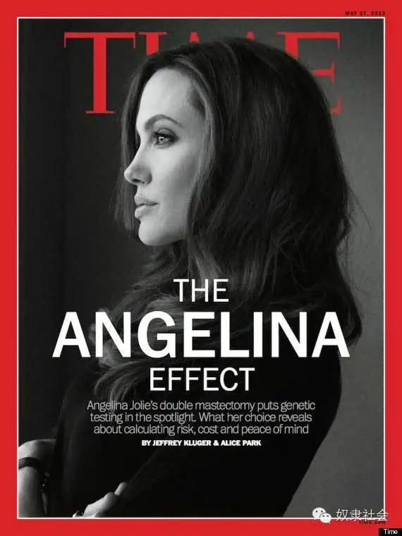 (b)每个人的细胞分裂一次产生突变的数目是不同的。这个主要受到遗传的影响,有些人天生就携带一些基因突变,这些突变虽然不能直接导致癌症,但是会让他们细胞每次分裂产生突变数目大大增加。去年好莱坞著名影星安吉丽娜·朱莉 (Angelina Jolie)在纽约时报撰文,说为了防止得乳腺癌而预防性切除双乳(2)。该新闻轰动全球。她作此决定的原因就是她家族和她本人都携带BRAC1基因突变,有了这个突变,她的细胞分裂产生的突变比正常高百倍,因此她家族多名女性,包括她的母亲都很早就得乳腺癌,她个人被估计有87%的可能性得乳腺癌,50%可能性得卵巢癌。她的这个举动,当时我从科学眼光看有点冲动,因为不能保证其它部位(尤其是卵巢)不会发生癌变,但是她的勇气还是让我无比佩服。后来我听说朱莉要把卵巢也切除,我只能想到一个词:“壮士断腕”。