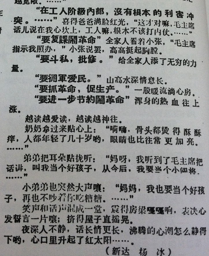 此篇,说的是“全家”在共享一本太祖“最新指示”的另类“小红书”(太祖的语录“小红书”比较通行,这个“最新指示“吗,鉴于太祖走到哪儿念叨到哪儿,“最新”不断,所以“普遍性”受些限制)。重点在“外面”冰霜温度下的冷,里面有了太祖的宏论“再有几个月的时间,整个形势会变得更好”,于是有比“熊熊的炉火”还厉害的“红彤彤的太阳”温度。全篇“文字享受”高潮处是“奶奶”的感受,把“小红书”拿过来贴在心上之后“嗬嗨,骨头都烫的酥酥痒,人都年轻了几十岁呦”。