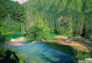 梯田般的丛林与波光粼粼的湖水相映成趣。湖水与瀑布,错落有致,层层相连。在众多形态各异的湖泊中,有一汪风姿独具的湖水。它的名字叫五彩池。五彩池的湖水呈现出神奇瑰丽的孔雀蓝色。这里,每坐山峰都是常年白雪皑皑、银装素裹。山谷,像一条玉带拦腰斩断了两侧的山峰。而山谷的底部就是美丽神奇的九寨沟。在这里,可以看到许多珍希动植物。憨态可掬的大熊猫,就像是这大自然的真正的主人。在这里,人类与自然和谐共处。