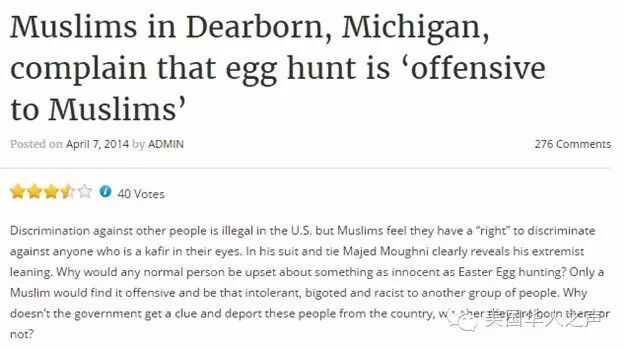 Egg Hunt 是小孩子非常喜欢的一个传统活动,在复活节周末高高兴兴地和父母,别的小朋友一起拾彩蛋,大人小孩都有乐趣。寻彩蛋已经在美国扎了根,有好多代了,但是在2014年【注4.1】,在Michigan的第耳崩 (Dearborn)镇,这个活动被一个有两个小学生的穆斯林父亲Majed Moughni抗议,说Egg Hunt让他“害怕基督徒在试图把穆斯林小孩儿皈依成基督教”,“违反了宪法中性原则”,要求取消寻彩蛋活动。