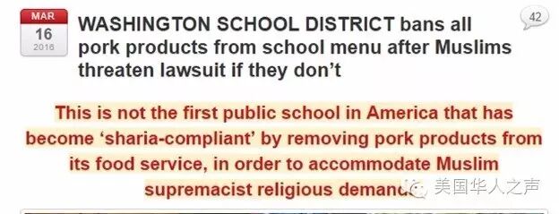 等学校提供清真食品后,等学校的穆斯林学生数目达到一定程度后,新的要求出笼:不要在学校餐厅看到猪肉食品!【注6】2016年3月在华盛顿州的肯特(Kent)市,穆斯林威胁学校如果不取消猪肉食品,他们将向教育部报告,并诉控学校!结果呢,学校缴械投降杜绝猪肉食品!