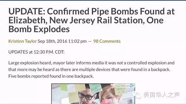 10. 周一凌晨(19日)新泽西伊丽莎白市地铁站发生爆炸,警方在排出炸弹时,一个炸弹爆炸。目前发现5枚炸弹。