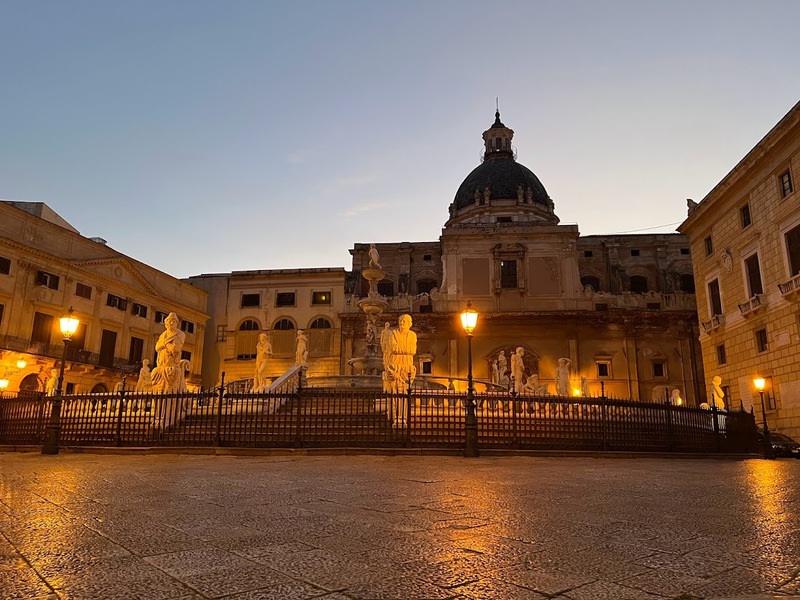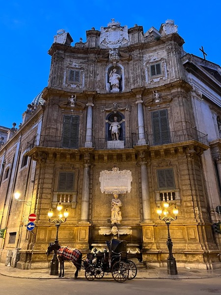 这是巴勒莫的中央广场, 是“新街”和维托里奥·埃马努埃利大街的十字路口,叫Quattro Canti( 四角)。过去这个十字路口把巴勒莫分成四个区,是曾经的市中心。
