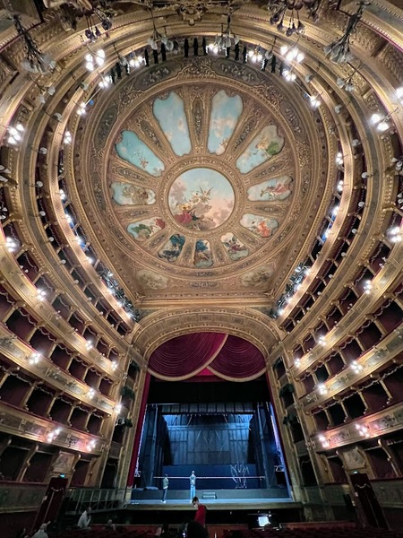 剧场里面很大,有六层观众席位,据说能坐下一千四百人。金碧辉煌的内景,远非纽约林肯中心的Met能比。舞台上正在举行彩排,也不知他们要演出什么。