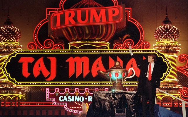 - In the late 1980s, after insisting that his major qualification to build a new casino in Atlantic City was that he wouldn’t need to use junk bonds, Trump used junk bonds to build Trump Taj Mahal. He built the casino, but couldn’t keep up with interest payments, so his company declared bankruptcy in 1991. He had to sell his yacht, his airline, and half his ownership in the casino.
