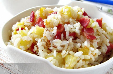 原料:土豆、洋葱、培根、冷米饭。盐、胡椒粉、孜然粉。
