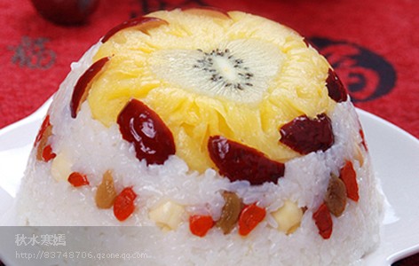 原料:大米糯米1:1,菠萝两片,猕猴桃一片,大红枣,葡萄干,枸杞子,莲子。