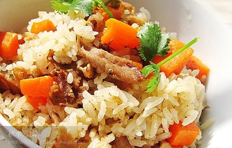 5.大米洗净入电锅,覆盖于羊肉汤料之上,使汤汁恰好与米平齐,按正常煮饭程序操作,煮好后以勺拌匀再焖至10分钟即可。