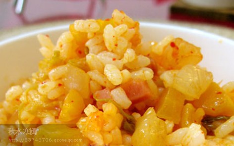 2.锅中倒入适量油烧热,放入葱末爆香,然后放入腌萝卜丁翻炒,再接着放入泡菜丁,继续翻炒,再放入火腿,炒匀,最后放入米饭不断翻炒拌匀,炒匀就可以吃了。