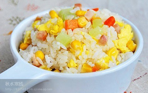 原料:鸡蛋、胡萝卜、莴笋、甜玉米粒、火腿、葱花、剩米饭。
