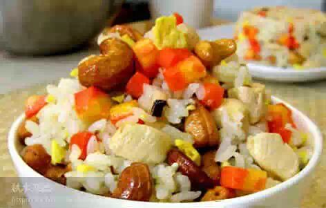 原料:米饭,鸡脯肉,鸡蛋,胡萝卜,香菇,熟腰果,葱花。盐。
