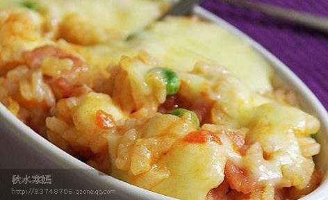 4.拌好的米饭放入烤碗,上面洒上一层马苏里拉奶酪碎,烤箱175度中层烤7分钟