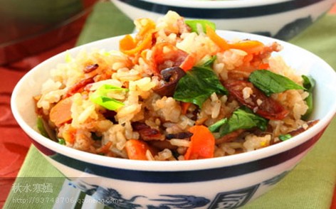 1.香肠切丁、大米洗净,比正常煮饭要少放一点点水,用电饭锅煮。