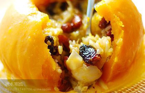 原料:南瓜1只(900克)、糯米150克、芸豆50克、葡萄干30克、蔓越莓干20克、百合60克、白糖少许。