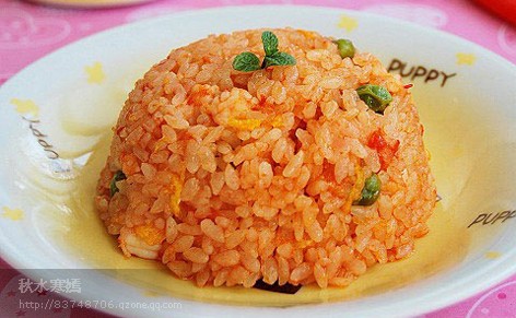 原料:米饭、番茄、虾仁、鸡蛋、番茄酱、鸡精、白胡椒粉、白糖、盐适量。
