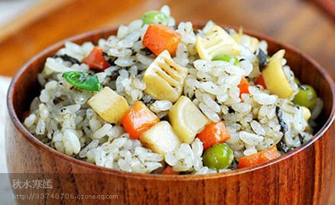 原料:凉米饭200克、春笋80克(去皮后)、胡萝卜40克、豌豆30克、榄菜2大匙、葱花5克。蚝油1大匙、盐1/2小匙。