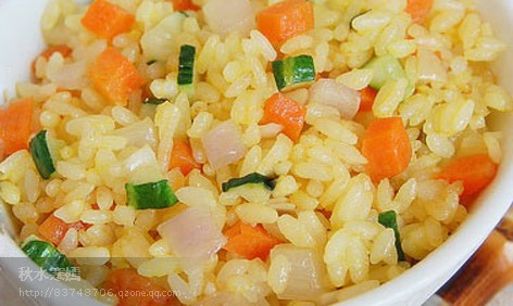原料:白米饭250克、蛋黄2个、胡萝卜1/2根、洋葱1/4个、黄瓜1/2根、盐3克、食用油15ml。