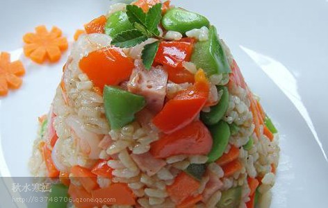 原料:胡萝卜、青毛豆仁、红甜椒、京华火腿午餐肉、绿甜椒、虾仁。