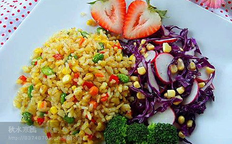 3.放入1料继续翻炒半分钟,加盐、胡椒粉、鸡精调味即可。另(甜玉米粒、紫色甘蓝丝、樱桃萝卜片+盐、橄榄油、胡椒粉)拌匀即成美味沙拉。