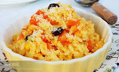 原料:大米130克、南瓜70克、洋葱20克、甜玉米粒30克、葡萄干20克。黄油(或色拉油)10克、淡奶油20克、盐少许。