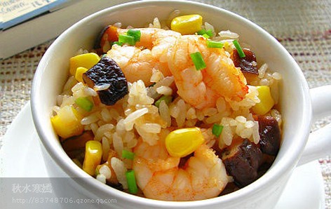 原料:鲜虾、香菇、玉米、冷米饭、葱姜、虾油、盐、料酒、胡椒粉、鸡精。