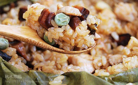 原料:鲜荷叶1张、糯米250克、鸡肉、干香菇、竹笋、豌豆。蚝油、料酒、老抽。