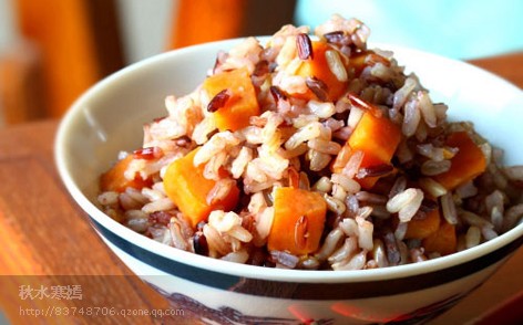 2.将杂粮米和红薯丁放入电饭煲,水量比平时蒸饭多加一点水,再加少许玉米油蒸熟即可。
