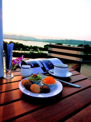 索菲特的钻石露台要论观景级别,恐怕VVS钻石尚可比拟。据说法国雅高的总裁一踏上这个露台就high了。大半个西湖尽收眼底,群山环抱着一湖碧水。夏夜的烧烤,午后的下午茶,或者看烟火、甚至结婚摆酒,在这里上演的桥段总是情调漫溢。