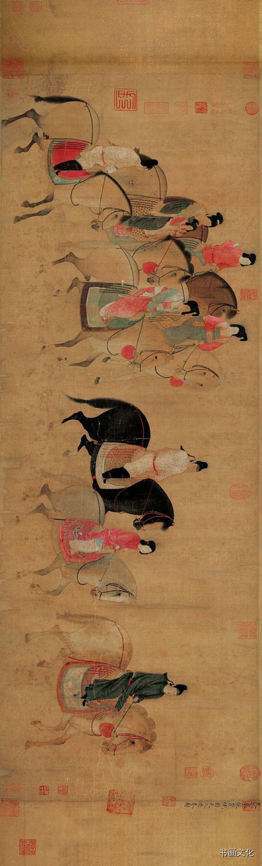 以下宋徽宗赵佶摹张萱 虢国夫人游春图卷,请把手机横过来欣赏: