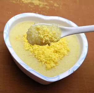 3. 鸡蛋剥去壳,取出蛋黄,放碗中用勺子碾碎,小米粥盛到碗内,上面撒上碎的蛋黄即可。