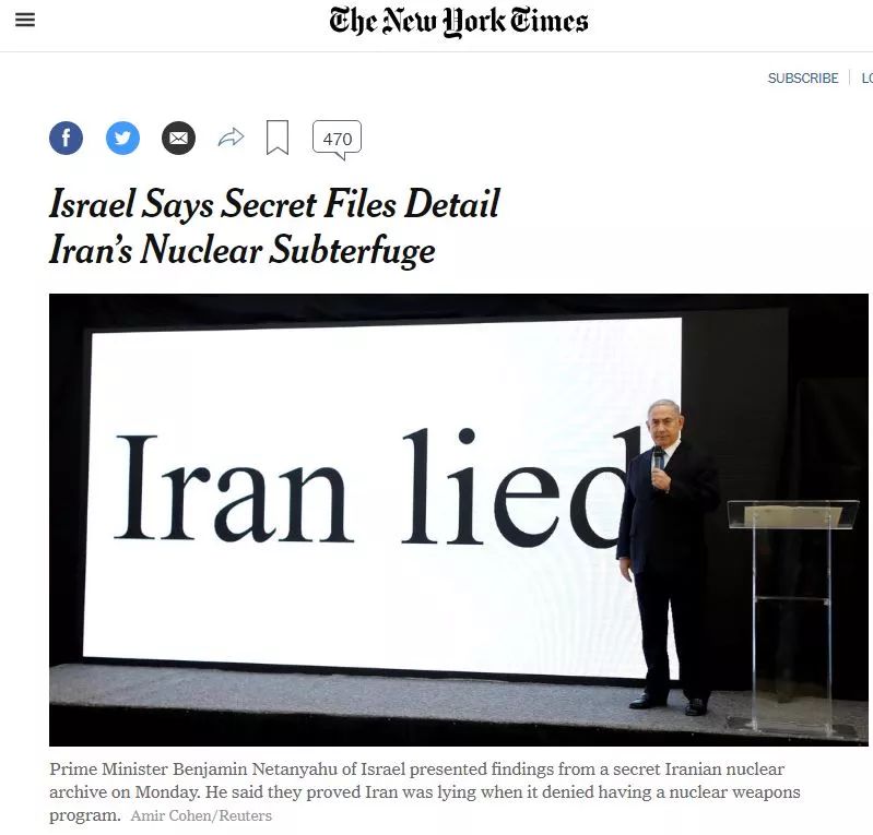 今天特朗普宣布撕毁伊朗核协议时用的理由引用了以色列总理本杰明·内塔尼亚胡几天前提出的以色列情报称:伊朗撒谎,违反了核协议。