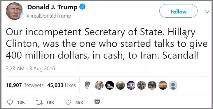 特朗普2016年8月4日推文:“我们不合格的国务卿希拉里·克林顿就是那个开始谈给伊朗4亿美元现金的人。丑闻!”