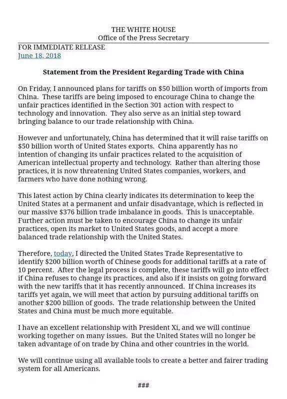 中国最近采取的这一行动清楚地表明,它决心置美国于永久不公平的地位,这反映在我们巨额的3760亿美元的贸易逆差中。这是无法接受的。我们必须采取进一步行动,促使中国改变其不公平的做法,对美国货物敞开市场大门,并接受与美国更平衡的贸易关系。