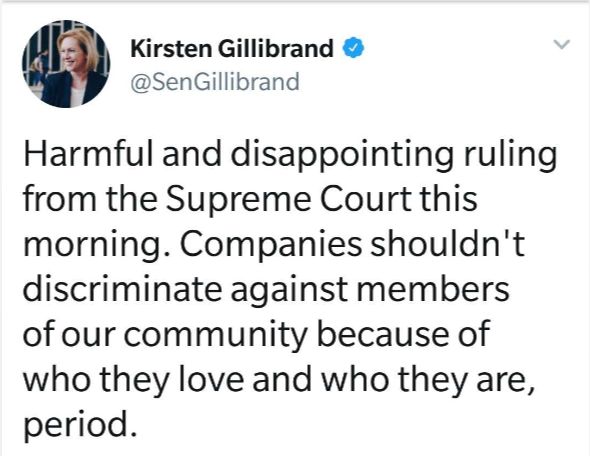 纽约州的民主党参议员kirsten gillibrand的推文表示,公司、企业绝不能因为他们是谁或他们爱谁而使社区里的人收到歧视。